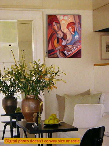 Second Virgin Hand-PaintedTwo musicians lean into a quiet collaboration, their forms softened by warm, layered color. The piano and string instrument intertwine visually, suggesting harmony built on listening. .